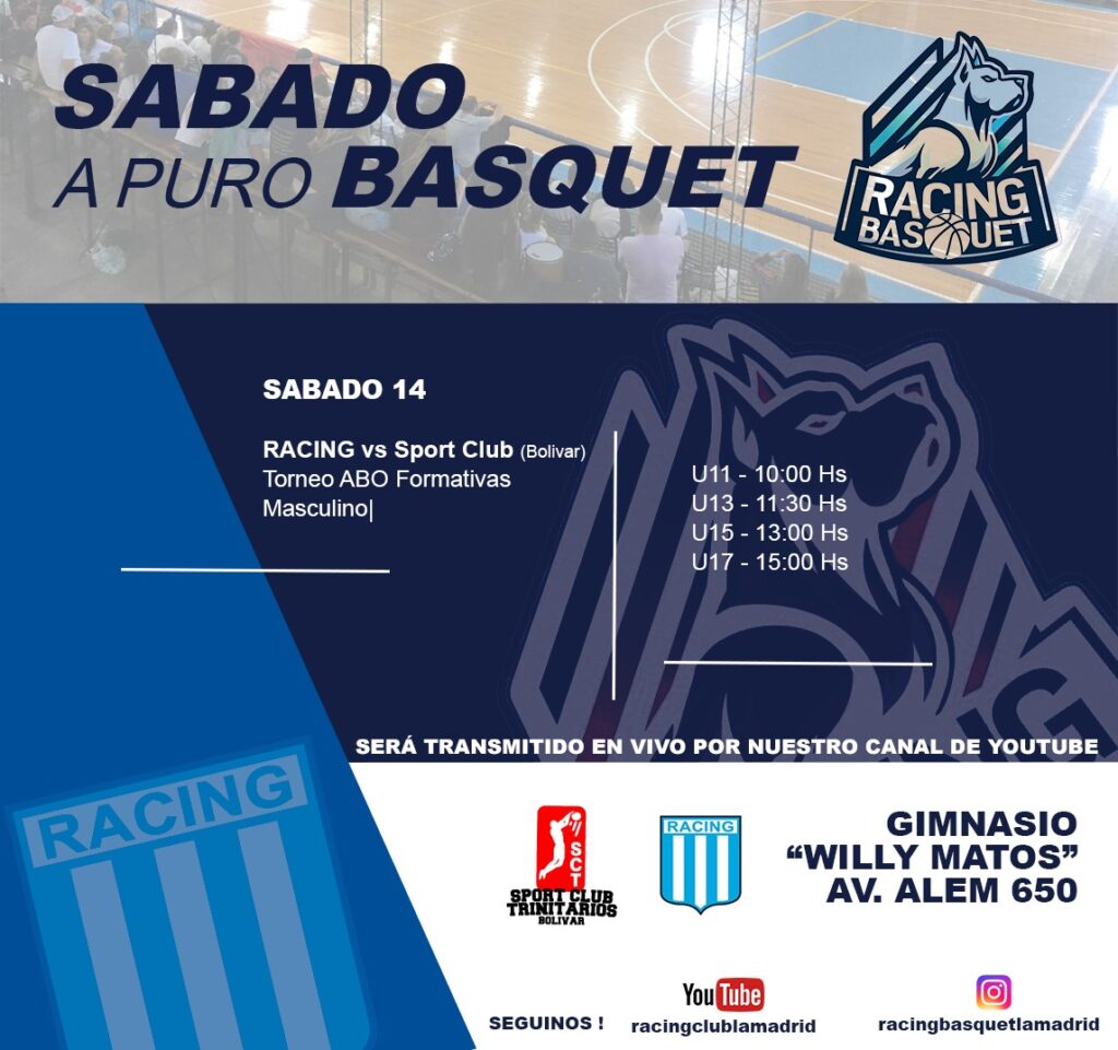 Este sábado y el domingo se jugarán los partidos de divisiones formativas de la ABO. Racing de La Madrid en su cancha recibe a Sport Trinitarios a partir de las 10:00 horas. Los cotejos en el gimnasio “José Luis ´Willy´ Matos” se podrán seguir vía streaming entrando al canal de YouTube de Racing.