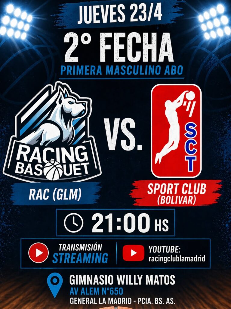 Hoy jueves, a partir de las 21:00 horas, Racing de La Madrid recibe a Sport Trinitarios de Bolívar. El partido es válido por la segunda fecha del torneo de Primera masculino organizado por la Asociación de Básquetbol de Olavarría.