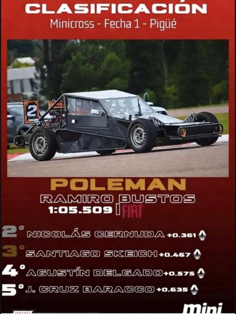 Mientras que en Minicross, la divisional con mayor cantidad de autos en la primera exigencia del año, el poleman fue Ramiro Bustos. Por su lado el lamatritense Emiliano Huici clasificó en el lugar 21°.