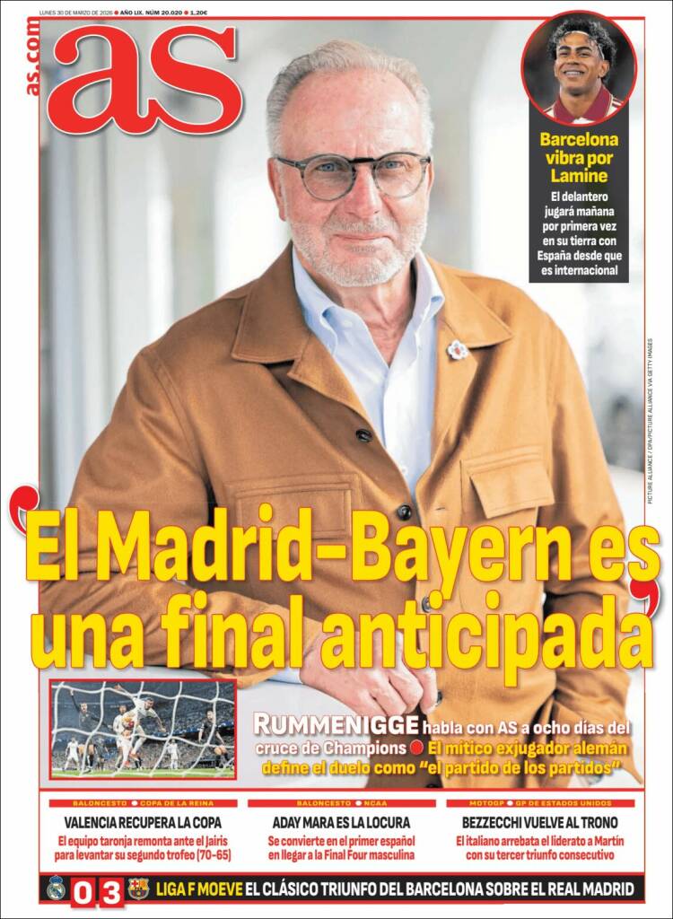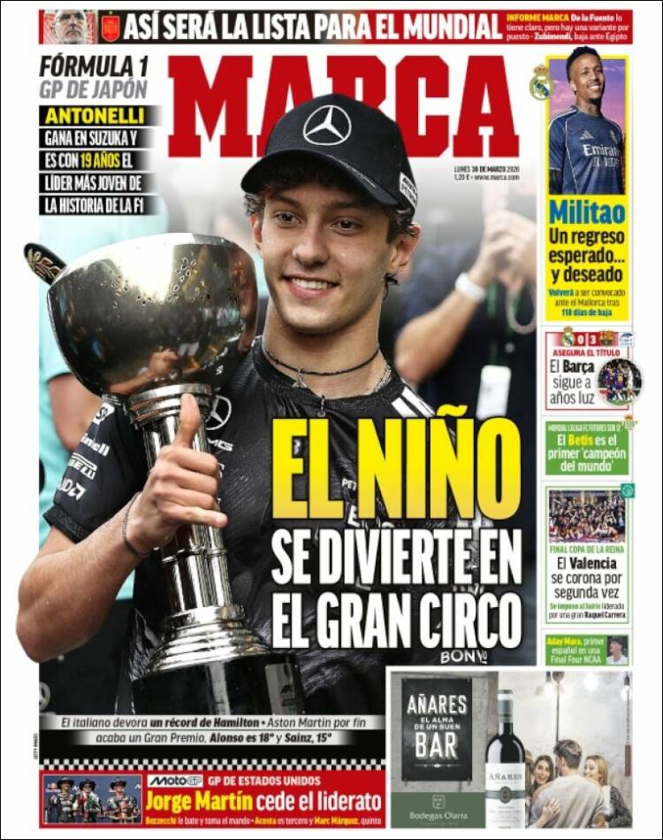 Corriere dello Sport y Marca hablan de la victoria de Kimi Antonelli en la carrera de F1 en Japón. El matutino italiano además destaca el triunfo de Marco Bezzechi en el circuito de “Las Américas” (EEUU) de MotoGP. El resto de los medios españoles sí hablan de la actualidad del fútbol del país ibérco.