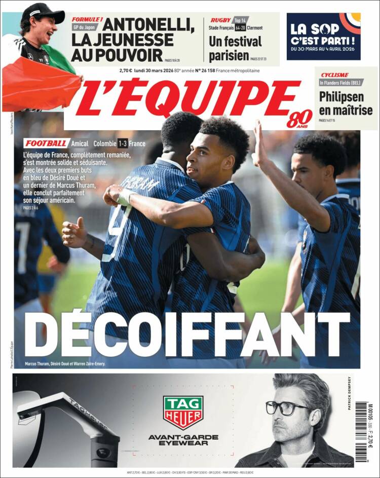 L´ Equipe tiene como tema central la victoria de la selección francesa de fútbol ante Colombia y Olé anticipa el partido de Argentina contra Zambia del martes.