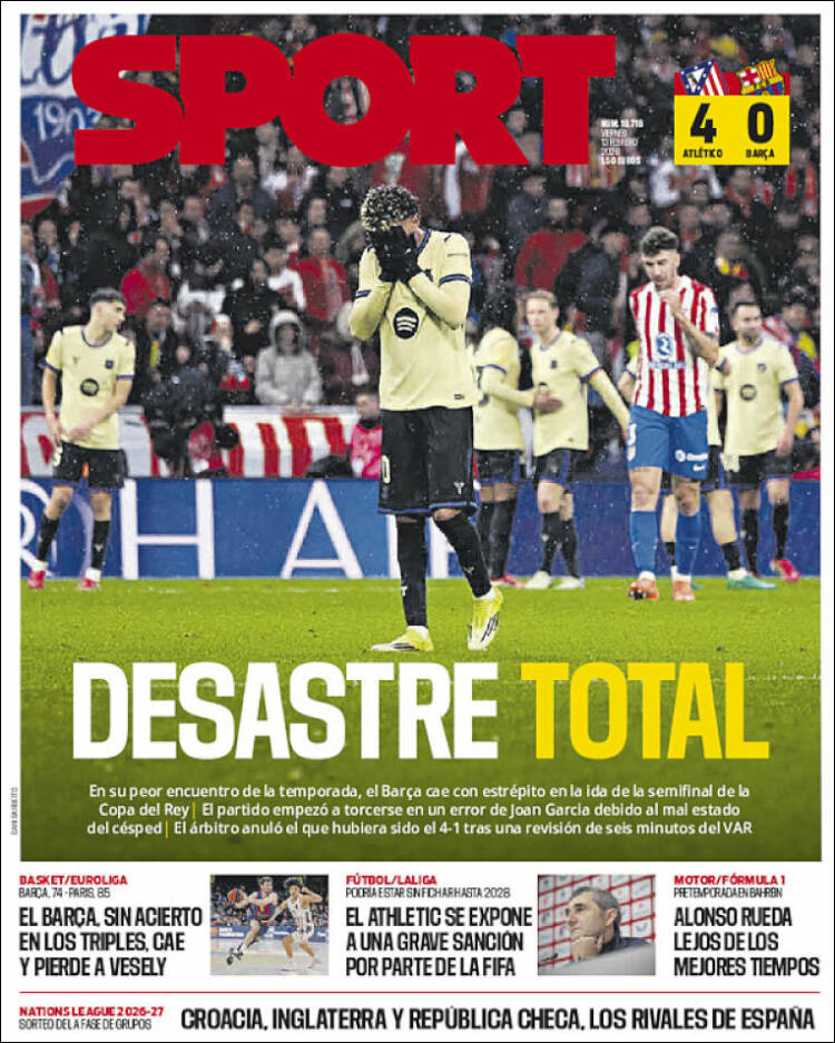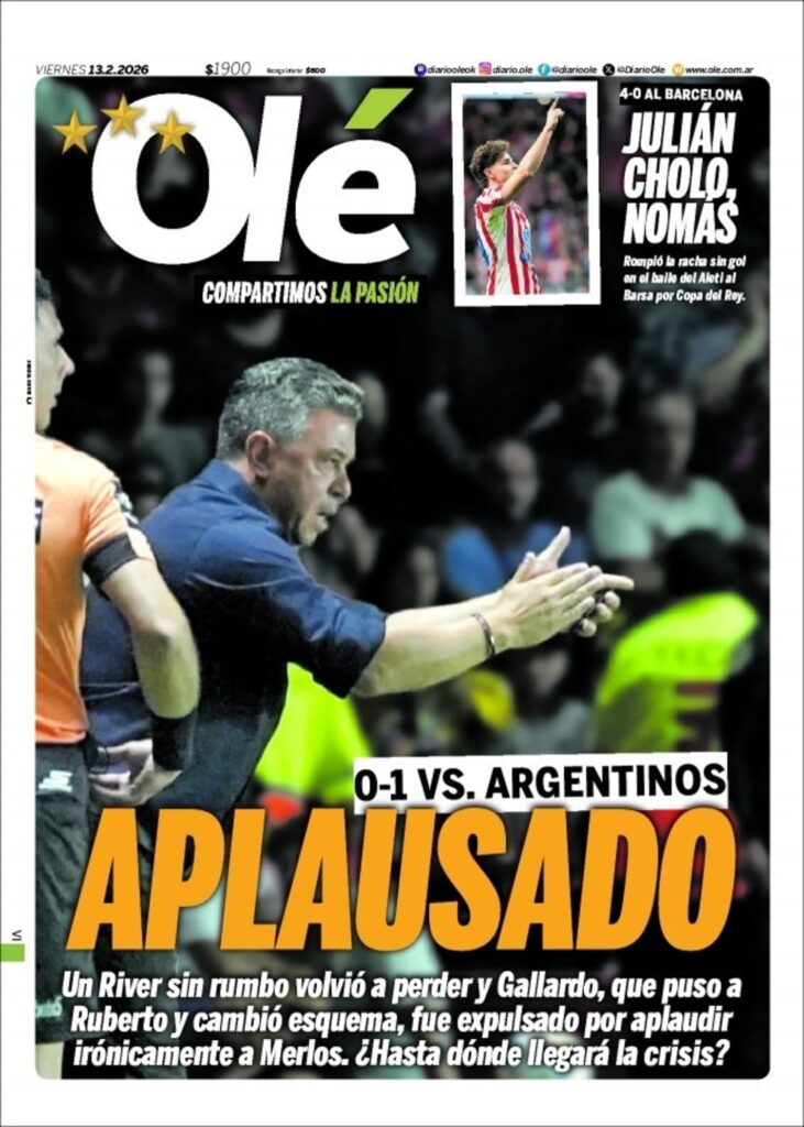 Este viernes los diarios deportivos del mundo reparten sus tapas en tres temas principales: Olé (Argentina) habla de la derrota de River ante Argentinos por la quinta fecha de la LPF; Corriere Dello Sport (Italia) y L´Equipe (Francia) se abocan a las Olimpíadas de invierno; mientras que los periódicos españoles (Marca, AS, Mundo deportivo y Sport) se centran en la goleada del Atlético Madrid contra Barcelona.