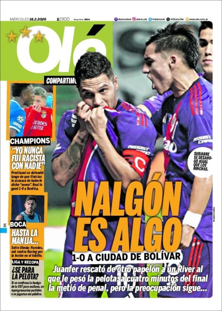 Los diarios deportivos del mundo definieron sus tapas para este miércoles 18 de febrero. Olé se encarga del triunfo de River sobre Ciudad de Bolívar por la Copa Argentina.