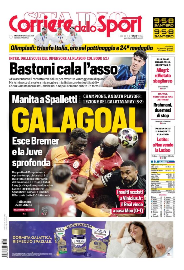Los medios españoles hacen foco en el duelo entre el Real Madrid y Benfica por la Champions Leage, y la realidad del Barcelona. Por su lado Corriere dello Sport (Italia) apunta a la caída de la Juventud ante el Galatasaray por el mismo torneo continental. L´Equipe (Francia) tiene como título principal las Olimpíadas de Invierno.