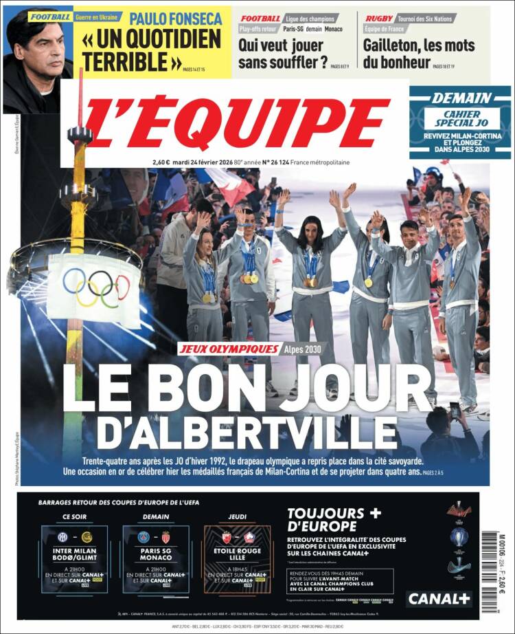Corriere dello Sport (Italia) hace foco en el próximo partido del Inter y L´ Equip (Francia) hace una síntesis del final de las Olimpíadas de Invierno.