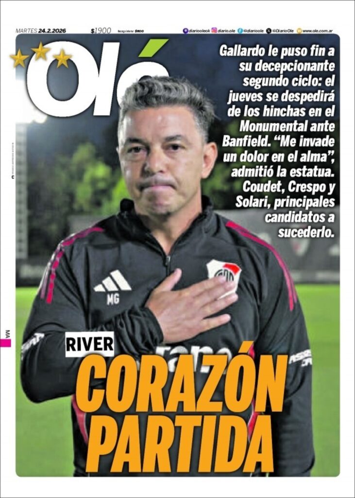 Olé, como era de esperarse, se concentra en la renuncia de Marcelo Gallardo a la conducción técnica de River. El DT millonario deja su cargo luego de varias derrotas; en este segundo ciclo, el “Muñeco” dirigió 84 partidos (35 victorias, 32 empates y 17 derrotas).