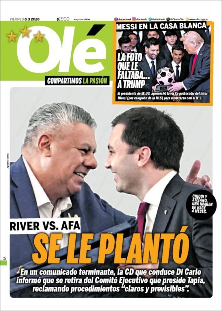 En el caso del periódico argentino se centra en la pelea entre River y la AFA. Por su lado el catalán hace referencia a las elecciones en el Barcelona.