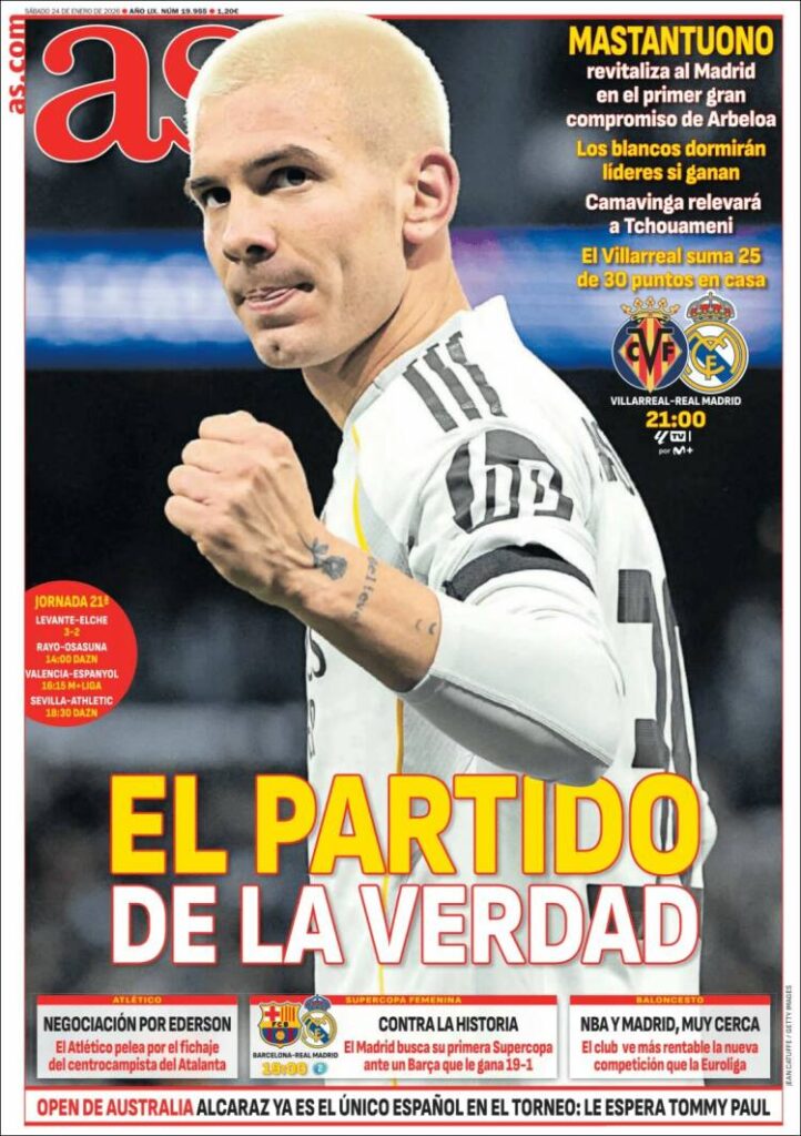 Te traemos las tapas de los diarios deportivos más importantes del mundo. Este sábado, el periódico español AS pone en tapa al azuleño Facundo Mastantuono y hace referencia al duelo entre el Real Madrid y Villareal.