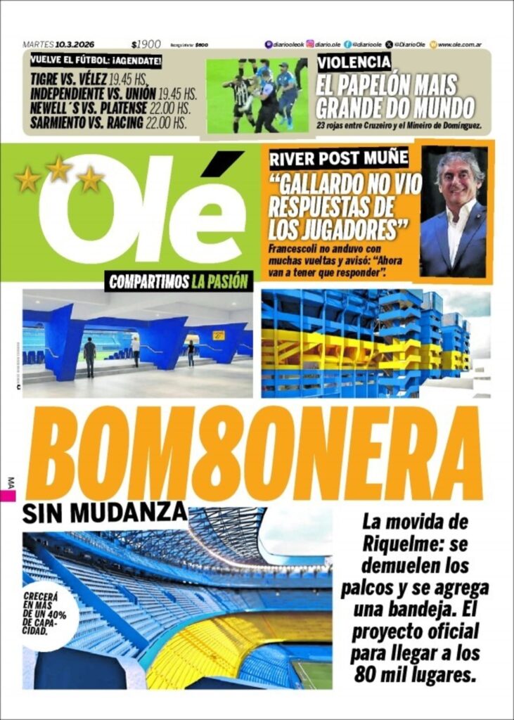 Olé reproduce una nota sobre la decisión de Boca de reformar la Bombonera. Corriere dello Sport es el único que habla específicamente de fútbol y se centra en la actualidad del campeonato italiano.