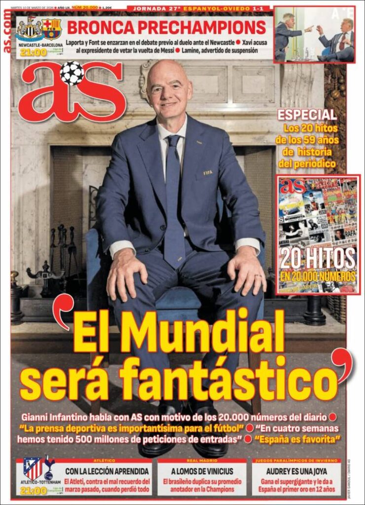 En España, a excepción de Marca, los demás periódicos se ocupan de las elecciones en el Barcelona y AS reproduce una nota a Gianni Infantino, presidente de la FIFA que habla del próximo mundial de fútbol.