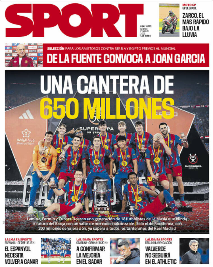 Rara vez en España los periódicos tienen algún título en común y se diferencian los madridistas de los barcelonistas. Este sábado, aunque se mantiene esa diferencia, AS, Marca, Sport y Mundo hablan de la posibilidad de que el arquero Joan García integre la selección.