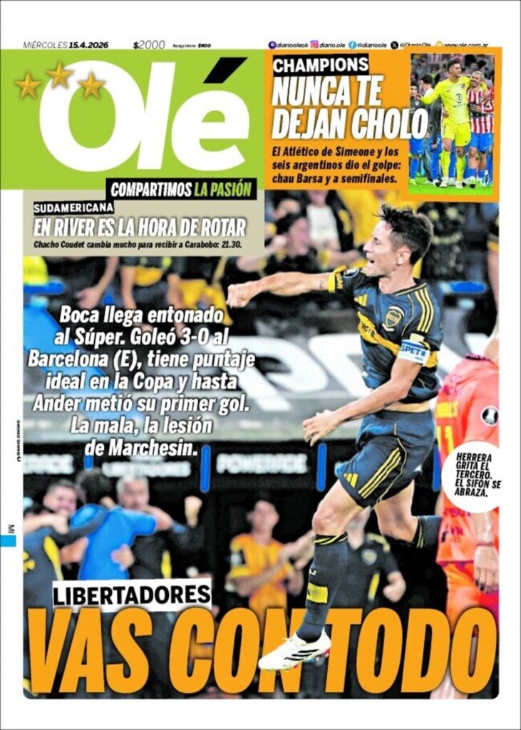 Este miércoles (15/4) los diarios deportivos del mundo tienen como tema central el fútbol. En el caso de los periódicos europeos siguen los resultados de la Champions League mientras que Olé se enfoca en el triunfo de Boca, en la Libertadores.