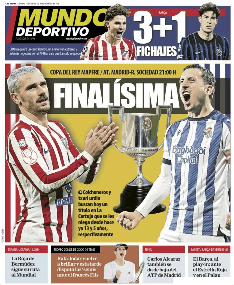 En el caso de Olé anticipa el súperclasico entre River y Boca. En España, la definición de la Copa del Rey se lleva la mayoría de los titulares. En Italia (Corriere dello Sport) y en Francia (L´ Equipe) se concentran en la definición de los respectivos campeonatos.