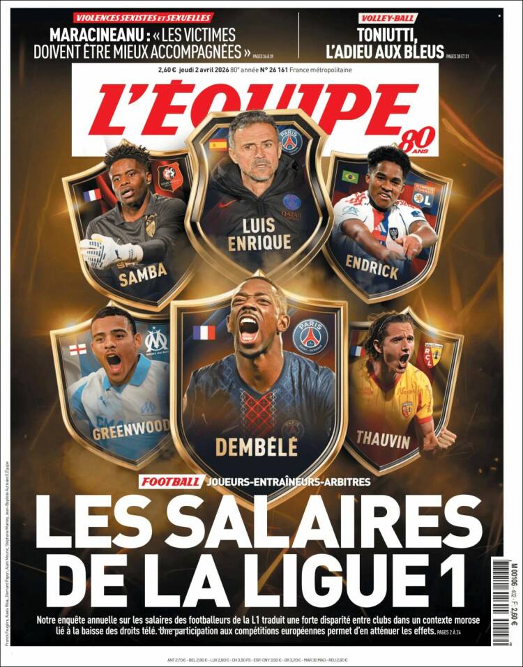Por su lado L´ Equipe tiene como título principal una investigación sobre los salarios de jugadores y Técnicos. Pero además hace un apartado sobre los hechos de violencia sexista y sexual.