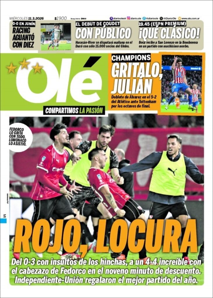 Olé se centra en el agónico empate de Independiente ante Unión de Santa Fe. El Rojo, tras ir perdiendo 0-3, terminó igualando 4-4 con un gol en tiempo de descuento. Otro título que elige el periódico argentino es la victoria del Atlético Madrid por la Champions League ante Totenham.
