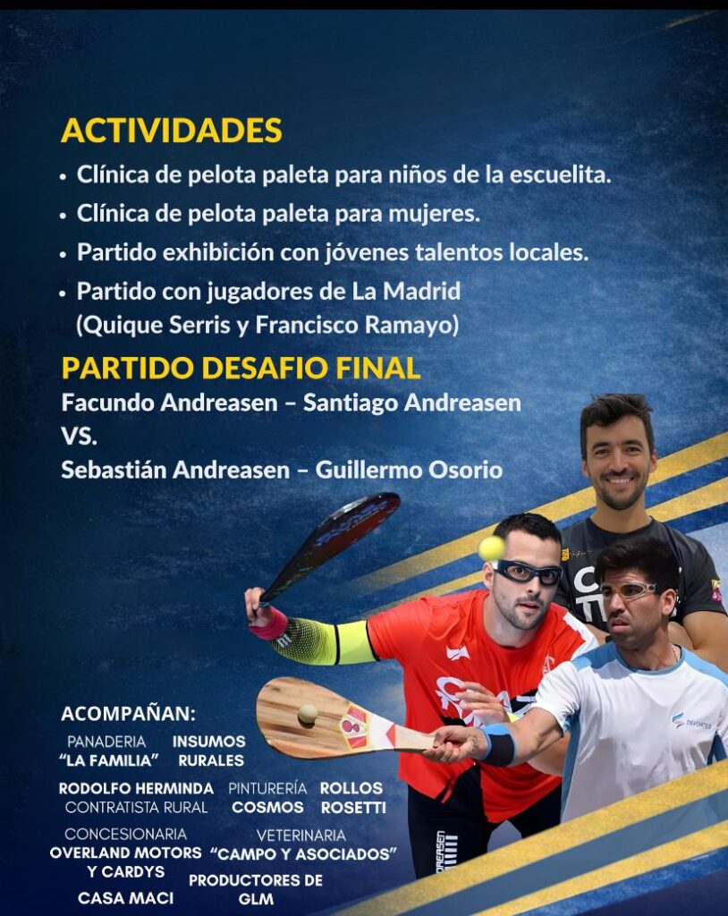 El plato fuerte de la jornada llegará con el partido desafío final, en el que Facundo Andreasen y Santiago Andreasen, campeones argentinos 2025 de pelota paleta, se enfrentarán a Sebastián Andreasen y Guillermo Osorio, protagonizando un duelo entre cuatro de los grandes exponentes de la disciplina en el país.