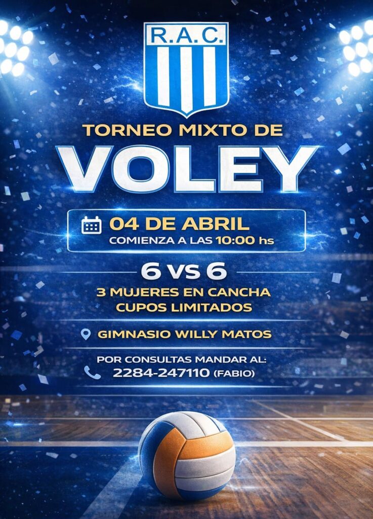 El próximo sábado 4 de abril se disputará un torneo amistoso de vóley mixto en el gimnasio “José Luis ´Willy´ Matos” de Racing. Por informes e inscripción los interesados deberán comunicarse al (2284) 247110.