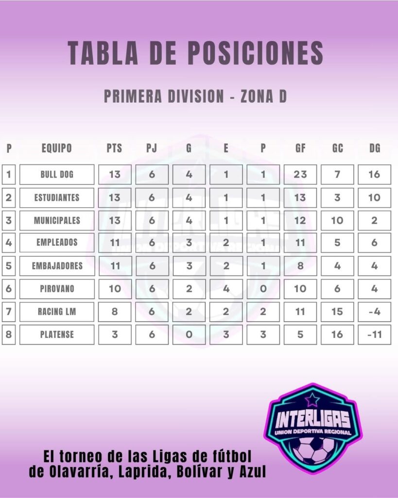 En la Zona D, la más pareja de todas, Bull Dog, Estudiantes (O) y Municipales tienen 13 puntos. Embajadores tiene 12, Empleados 11 y Pirovano 10. Racing de La Madrid está más abajo con 8 unidades y cierra Platense con tan solo 3 puntos.