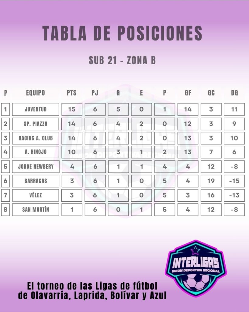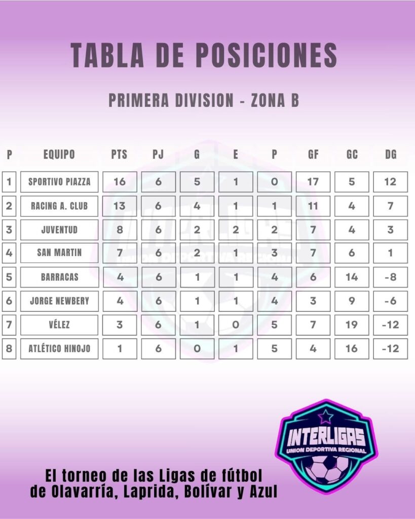 Zona B: Juventud 15, Racing (O) y Sp. Piazza 14, Hinojo 10, J. Newbery y San Martín 4, Barracas 3 y Vélez cierra sin unidades.