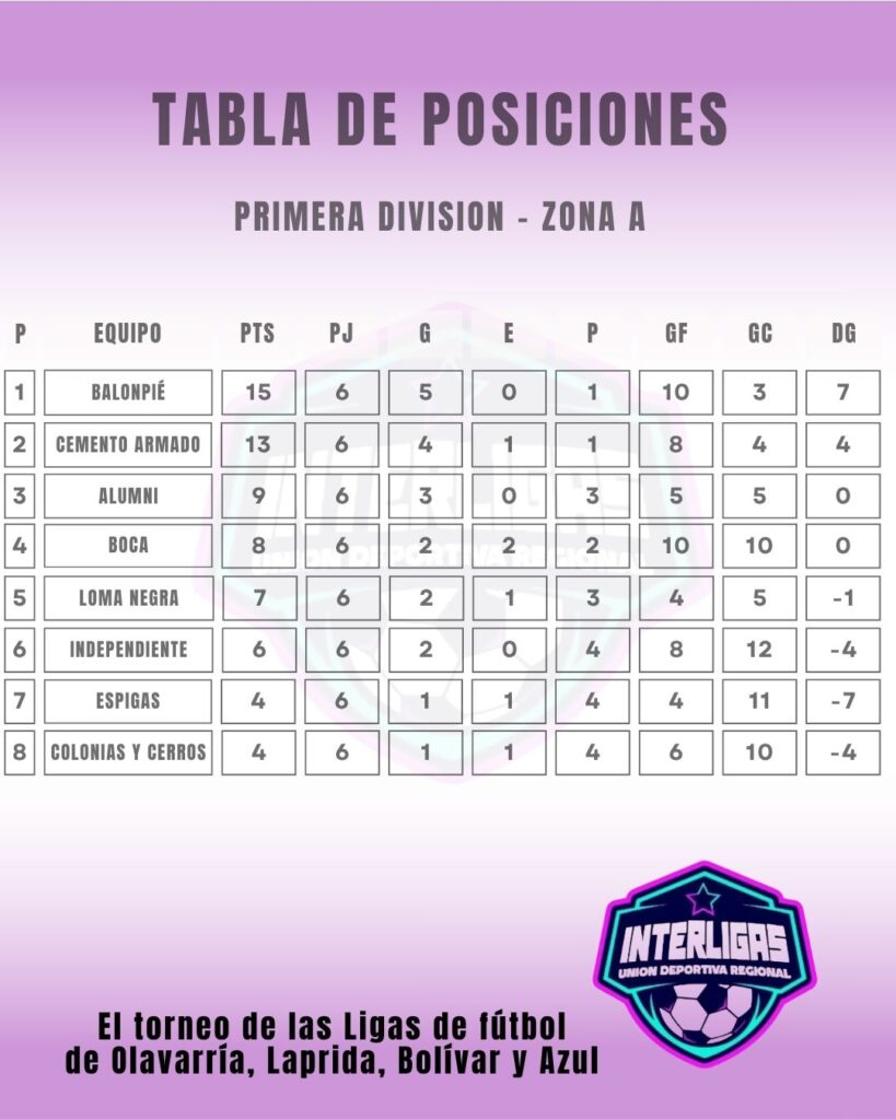 Zona A: Balompie y Boca 16 puntos, Alumni y Cemento 7, Loma Negra 6, C. y Cerros 5, Espigas 2 e Independiente 1.
